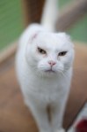 Winnie may have lost the upright part of her ears, but she didn’t loose her fighting spirit. By the time she arrived in foster-care, she had recovered from her surgery and put on some weight and her fur, dirty and stained yellow when she was found, looked fluffy and white again. With her dignity restored, she would sit on her shelf in her pen, watching the birds in the garden and squawking at anyone who walked past. Her meow sounded like an old parrot, a real gravelly croak, and she always looked like she was looking at you with suspicion because her eyes were always half-shut due to her ongoing chronic conjunctivitis condition.